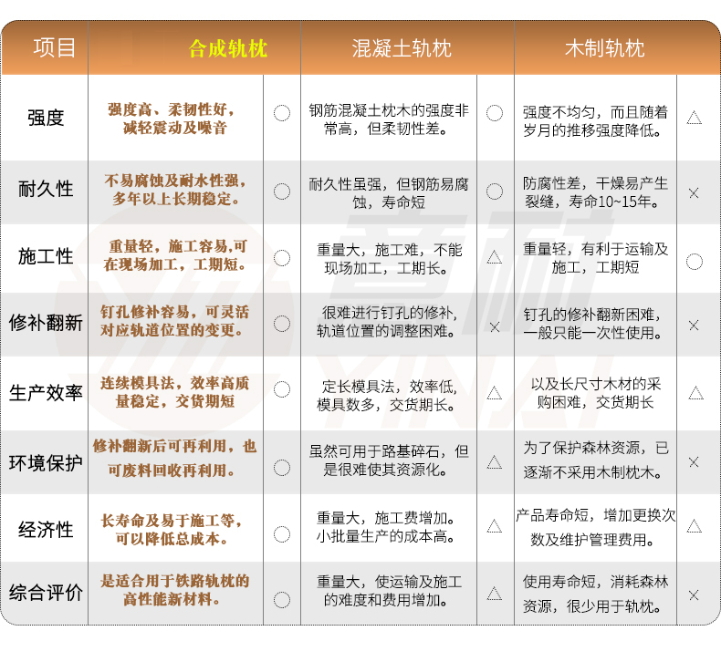 復合軌枕彈性好,可提高軌道結構 的整體彈性,減小列車行車行駛中的振 動影響和對環境的噪音污染,適合在鐵 路橋梁、鋼梁區域使用